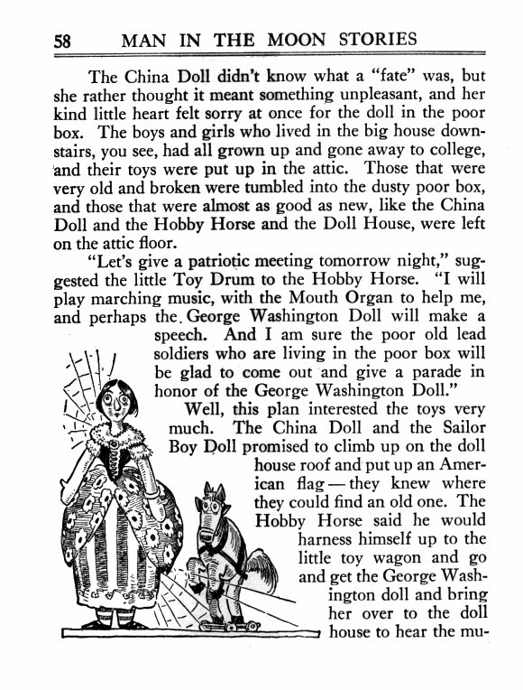 Well, this plan interested the toys very much. The China Doll and the Sailor Boy Doll promised to climb up on the doll house roof and put up an American flag—they knew where they could find an old one. The Hobby Horse said he would harness himself up to the little toy wagon and go and get the George Washington doll and bring her over to the doll house to hear the mu-