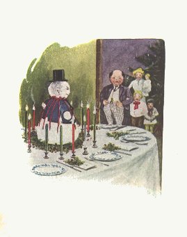 | Hannah began to set the table for Christmas dinner. Right in the center of her table, after she had put on a beautiful linen tablecloth, she put Mr. White. Dear me, he did look handsome! His tall hat was very shiny, his jacket was very blue, and he seemed to have a lot of little red ribbons coming out of his neck. A lovely wreath of holly was placed around him and the tall red candles that he had always ad- mired. Then Hannah went back and forth, from the pantry to the table, putting on the best plates and the tall glasses that sparkled because she had polished them so nicely, and the very necessary knives and forks. 18 |