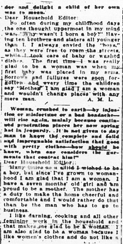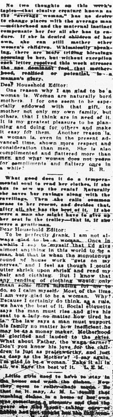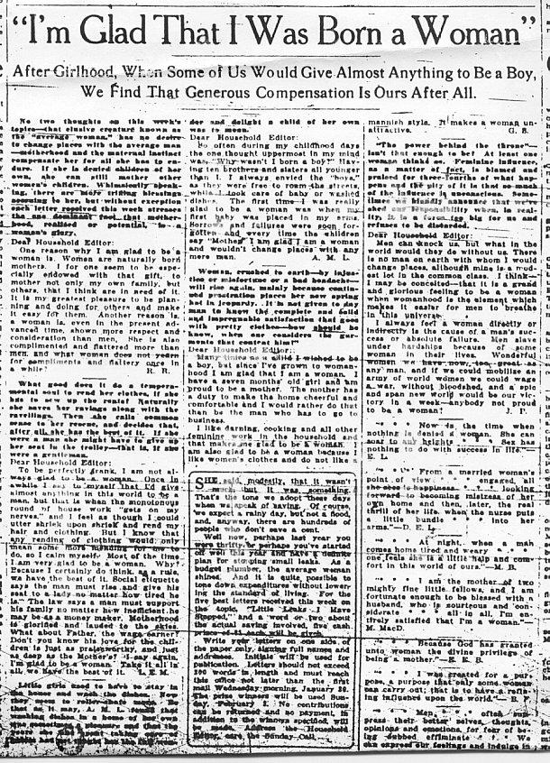 the topic "Why I Am Glad I Am a Woman," five cash prizes of $1 each will be given."